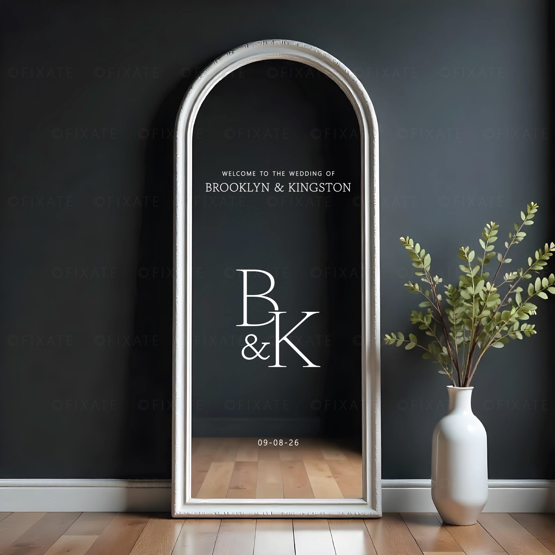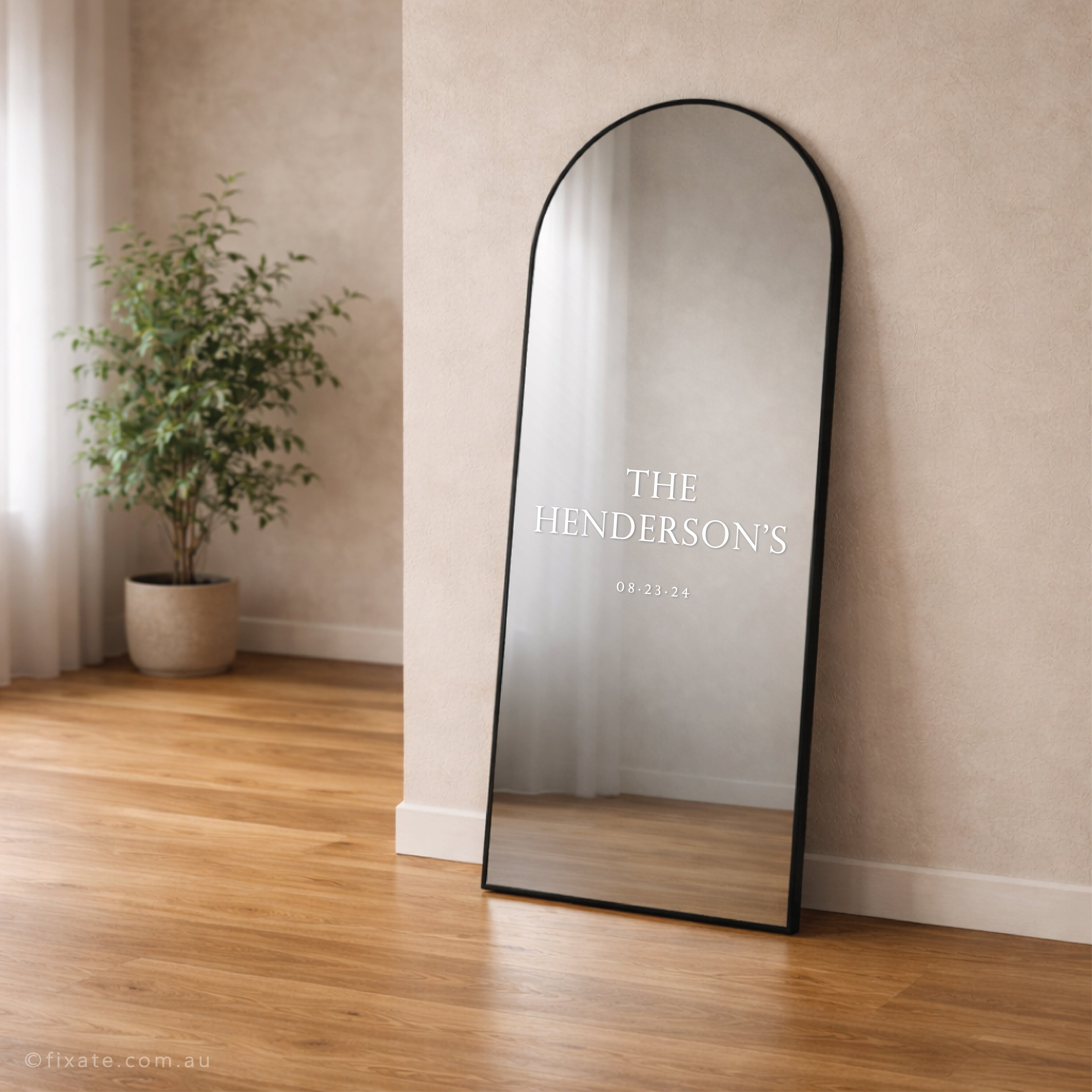 Each decal is customised with your names and wedding date and carefully sized to suit common wedding mirror dimensions including large standing mirrors, arched mirrors and framed mirrors used for wedding welcome displays.